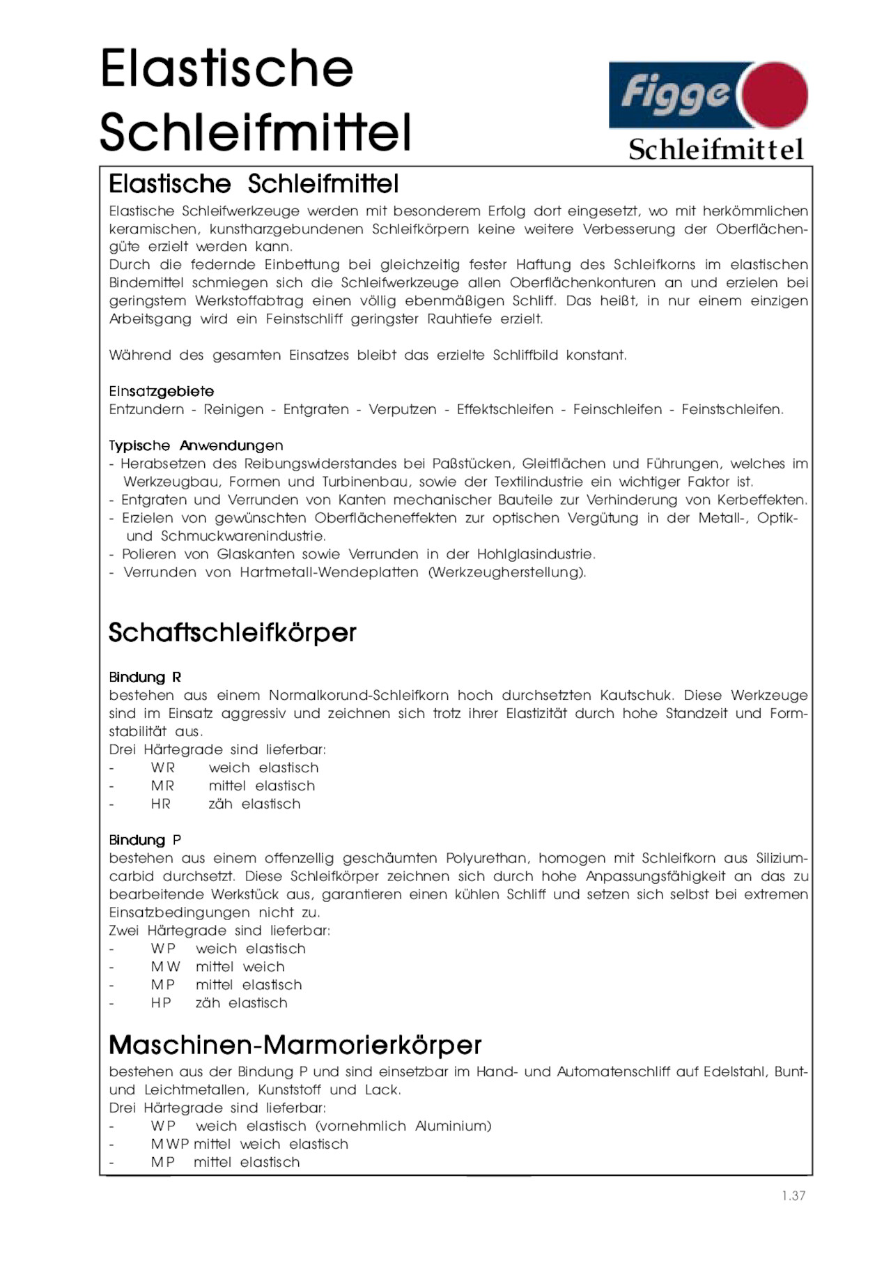 Elastische Schleifmittel Elastische Schleifmittel Schleifmittel Elastische Schleifwerkzeuge werden mit besonderem Erfolg dort eingesetzt, wo mit herkömmlichen keramischen, kunstharzgebundenen Schleifkörpern keine weitere Verbesserung der Oberflächengüte erzielt werden kann. Durch die federnde Einbettung bei gleichzeitig fester Haftung des Schleifkorns im elastischen Bindemittel schmiegen sich die Schleifwerkzeuge allen Oberflächenkonturen an und erzielen bei geringstem Werkstoffabtrag einen völlig ebenmäßigen Schliff. Das heißt, in nur einem einzigen Arbeitsgang wird ein Feinstschliff geringster Rauhtiefe erzielt. Während des gesamten Einsatzes bleibt das erzielte Schliffbild konstant. Einsatzgebiete Entzundern - Reinigen - Entgraten - Verputzen - Effektschleifen - Feinschleifen - Feinstschleifen. Typische Anwendungen - Herabsetzen des Reibungswiderstandes bei Paßstücken, Gleitflächen und Führungen, welches im Werkzeugbau, Formen und Turbinenbau, sowie der Textilindustrie ein wichtiger Faktor ist. - Entgraten und Verrunden von Kanten mechanischer Bauteile zur Verhinderung von Kerbeffekten. - Erzielen von gewünschten Oberflächeneffekten zur optischen Vergütung in der Metall-, Optikund Schmuckwarenindustrie. - Polieren von Glaskanten sowie Verrunden in der Hohlglasindustrie. - Verrunden von Hartmetall-Wendeplatten (Werkzeugherstellung). Schaftschleifkörper Bindung R bestehen aus einem Normalkorund-Schleifkorn hoch durchsetzten Kautschuk. Diese Werkzeuge sind im Einsatz aggressiv und zeichnen sich trotz ihrer Elastizität durch hohe Standzeit und Formstabilität aus. Drei Härtegrade sind lieferbar: WR weich elastisch MR mittel elastisch HR zäh elastisch Bindung P bestehen aus einem offenzellig geschäumten Polyurethan, homogen mit Schleifkorn aus Siliziumcarbid durchsetzt. Diese Schleifkörper zeichnen sich durch hohe Anpassungsfähigkeit an das zu bearbeitende Werkstück aus, garantieren einen kühlen Schliff und setzen sich selbst bei extremen Einsatzbedingungen nicht zu. Zwei Härtegrade sind lieferbar: W P weich elastisch M W mittel weich M P mittel elastisch HP zäh elastisch Maschinen-Marmorierkörper bestehen aus der Bindung P und sind einsetzbar im Hand- und Automatenschliff auf Edelstahl, Buntund Leichtmetallen, Kunststoff und Lack. Drei Härtegrade sind lieferbar: W P weich elastisch (vornehmlich Aluminium) M W P mittel weich elastisch M P mittel elastisch 1.37