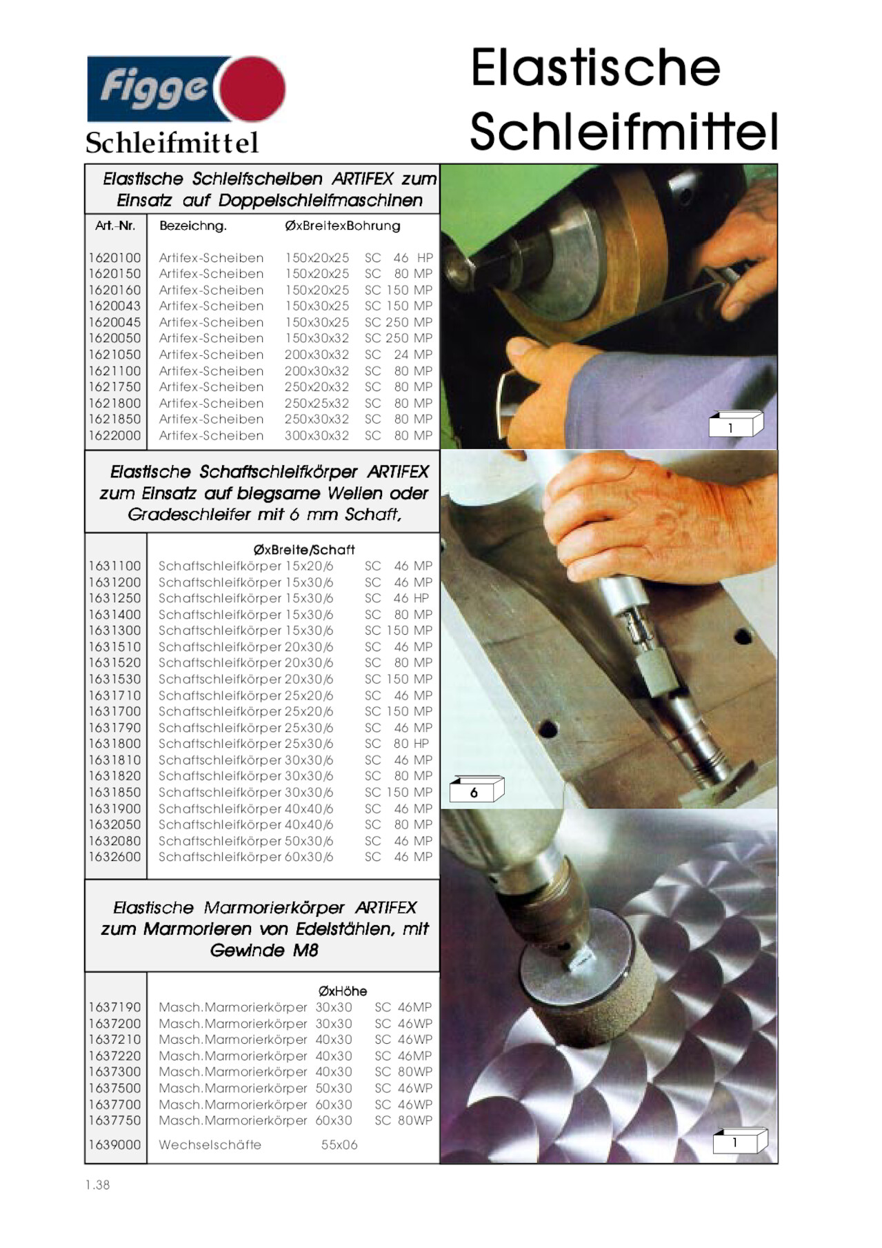 Schleifmittel Elastische Schleifscheiben ARTIFEX zum Einsatz auf Doppelschleifmaschinen Art.-Nr. 1620100 1620150 1620160 1620043 1620045 1620050 1621050 1621100 1621750 1621800 1621850 1622000 Bezeichng. Artifex-Scheiben Artifex-Scheiben Artifex-Scheiben Artifex-Scheiben Artifex-Scheiben Artifex-Scheiben Artifex-Scheiben Artifex-Scheiben Artifex-Scheiben Artifex-Scheiben Artifex-Scheiben Artifex-Scheiben ØxBreitexBohrung 150x20x25 150x20x25 150x20x25 150x30x25 150x30x25 150x30x32 200x30x32 200x30x32 250x20x32 250x25x32 250x30x32 300x30x32 SC SC SC SC SC SC SC SC SC SC SC SC 46 80 150 150 250 250 24 80 80 80 80 80 HP MP MP MP MP MP MP MP MP MP MP MP Elastische Schleifmittel 1 Elastische Schaftschleifkörper ARTIFEX zum Einsatz auf biegsame Wellen oder Gradeschleifer mit 6 mm Schaft, 1631100 1631200 1631250 1631400 1631300 1631510 1631520 1631530 1631710 1631700 1631790 1631800 1631810 1631820 1631850 1631900 1632050 1632080 1632600 ØxBreite/Schaft Schaftschleifkörper 15x20/6 Schaftschleifkörper 15x30/6 Schaftschleifkörper 15x30/6 Schaftschleifkörper 15x30/6 Schaftschleifkörper 15x30/6 Schaftschleifkörper 20x30/6 Schaftschleifkörper 20x30/6 Schaftschleifkörper 20x30/6 Schaftschleifkörper 25x20/6 Schaftschleifkörper 25x20/6 Schaftschleifkörper 25x30/6 Schaftschleifkörper 25x30/6 Schaftschleifkörper 30x30/6 Schaftschleifkörper 30x30/6 Schaftschleifkörper 30x30/6 Schaftschleifkörper 40x40/6 Schaftschleifkörper 40x40/6 Schaftschleifkörper 50x30/6 Schaftschleifkörper 60x30/6 SC SC SC SC SC SC SC SC SC SC SC SC SC SC SC SC SC SC SC 46 46 46 80 150 46 80 150 46 150 46 80 46 80 150 46 80 46 46 MP MP HP MP MP MP MP MP MP MP MP HP MP MP MP MP MP MP MP 6 Elastische Marmorierkörper ARTIFEX zum Marmorieren von Edelstählen, mit Gewinde M8 1637190 1637200 1637210 1637220 1637300 1637500 1637700 1637750 1639000 1.38 Masch.Marmorierkörper Masch.Marmorierkörper Masch.Marmorierkörper Masch.Marmorierkörper Masch.Marmorierkörper Masch.Marmorierkörper Masch.Marmorierkörper Masch.Marmorierkörper Wechselschäfte ØxHöhe 30x30 30x30 40x30 40x30 40x30 50x30 60x30 60x30 55x06 SC SC SC SC SC SC SC SC 46MP 46WP 46WP 46MP 80WP 46WP 46WP 80WP 1