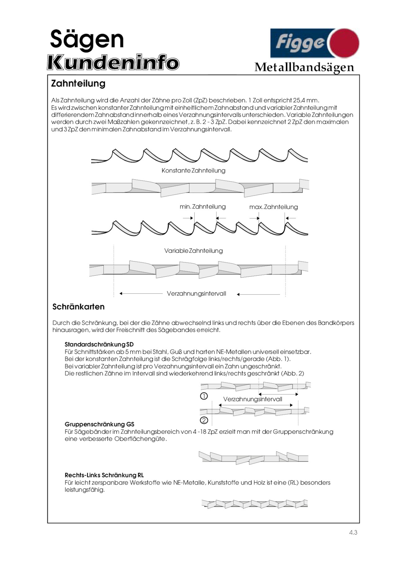 Sägen Metallbandsägen Zahnteilung Als Zahnteilung wird die Anzahl der Zähne pro Zoll (ZpZ) beschrieben. 1 Zoll entspricht 25,4 mm. Es wird zwischen konstanter Zahnteilung mit einheitlichem Zahnabstand und variabler Zahnteilung mit differierendem Zahnabstand innerhalb eines Verzahnungsintervalls unterschieden. Variable Zahnteilungen werden durch zwei Maßzahlen gekennzeichnet, z. B. 2 - 3 ZpZ. Dabei kennzeichnet 2 ZpZ den maximalen und 3 ZpZ den minimalen Zahnabstand im Verzahnungsintervall. Konstante Zahnteilung min. Zahnteilung max. Zahnteilung Variable Zahnteilung Verzahnungsintervall Schränkarten Durch die Schränkung, bei der die Zähne abwechselnd links und rechts über die Ebenen des Bandkörpers hinausragen, wird der Freischnitt des Sägebandes erreicht. Standardschränkung SD Für Schnittstärken ab 5 mm bei Stahl, Guß und harten NE-Metallen universell einsetzbar. Bei der konstanten Zahnteilung ist die Schrägfolge links/rechts/gerade (Abb. 1). Bei variabler Zahnteilung ist pro Verzahnungsintervall ein Zahn ungeschränkt. Die restlichen Zähne im Intervall sind wiederkehrend links/rechts geschränkt (Abb. 2) 1 Verzahnungsintervall 2 Gruppenschränkung GS Für Sägebänder im Zahnteilungsbereich von 4 -18 ZpZ erzielt man mit der Gruppenschränkung eine verbesserte Oberflächengüte. Rechts-Links Schränkung RL Für leicht zerspanbare Werkstoffe wie NE-Metalle, Kunststoffe und Holz ist eine (RL) besonders leistungsfähig. 4.3
