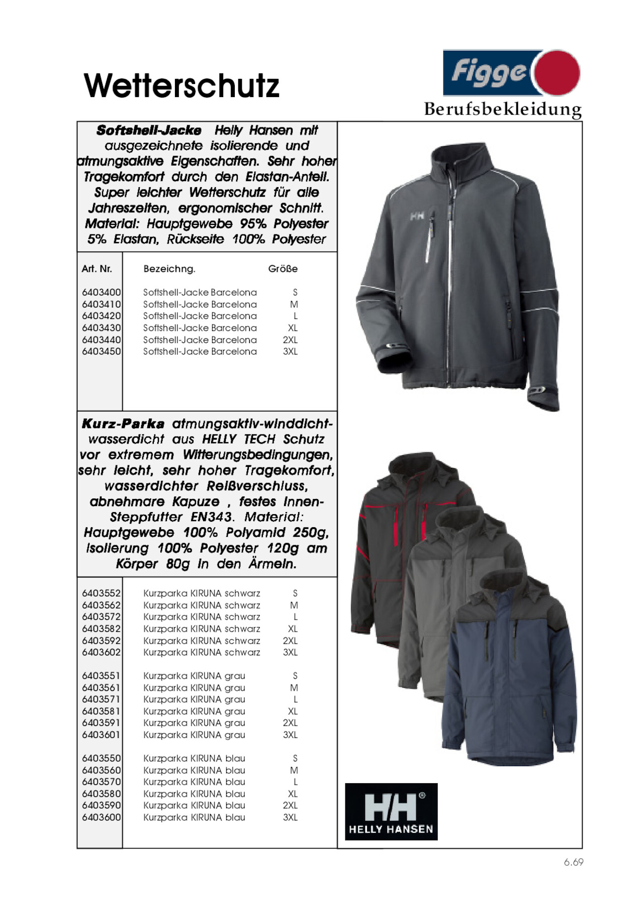 Wetterschutz Softshell-Jacke Helly Hansen mit ausgezeichnete isolierende und atmungsaktive Eigenschaften. Sehr hoher Tragekomfort durch den Elastan-Anteil. Super leichter Wetterschutz für alle Jahreszeiten, ergonomischer Schnitt. Material: Hauptgewebe 95% Polyester 5% Elastan, Rückseite 100% Polyester Art. Nr. 6403400 6403410 6403420 6403430 6403440 6403450 Bezeichng. Größe Softshell-Jacke Barcelona Softshell-Jacke Barcelona Softshell-Jacke Barcelona Softshell-Jacke Barcelona Softshell-Jacke Barcelona Softshell-Jacke Barcelona S M L XL 2XL 3XL Kurz-Parka atmungsaktiv-winddichtwasserdicht aus HELLY TECH Schutz vor extremem Witterungsbedingungen, sehr leicht, sehr hoher Tragekomfort, wasserdichter Reißverschluss, abnehmare Kapuze , festes Innen- Steppfutter EN343. Material: Hauptgewebe 100% Polyamid 250g, Isolierung 100% Polyester 120g am Körper 80g in den Ärmeln. 6403552 6403562 6403572 6403582 6403592 6403602 6403551 6403561 6403571 6403581 6403591 6403601 6403550 6403560 6403570 6403580 6403590 6403600 Kurzparka KIRUNA schwarz Kurzparka KIRUNA schwarz Kurzparka KIRUNA schwarz Kurzparka KIRUNA schwarz Kurzparka KIRUNA schwarz Kurzparka KIRUNA schwarz Kurzparka KIRUNA grau Kurzparka KIRUNA grau Kurzparka KIRUNA grau Kurzparka KIRUNA grau Kurzparka KIRUNA grau Kurzparka KIRUNA grau Kurzparka KIRUNA blau Kurzparka KIRUNA blau Kurzparka KIRUNA blau Kurzparka KIRUNA blau Kurzparka KIRUNA blau Kurzparka KIRUNA blau S M L XL 2XL 3XL S M L XL 2XL 3XL S M L XL 2XL 3XL Berufsbekleidung 6.69